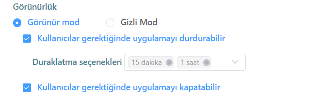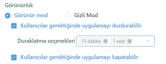 - “Kullanıcılar gerektiğinde uygulamayı kapatabilir.” seçeneği aktifleştirilir ise, çalışanlar uygulamayı tamamen pasif hale getirebilirler. Böylece istedikleri zaman tekrar kapatabilirler.