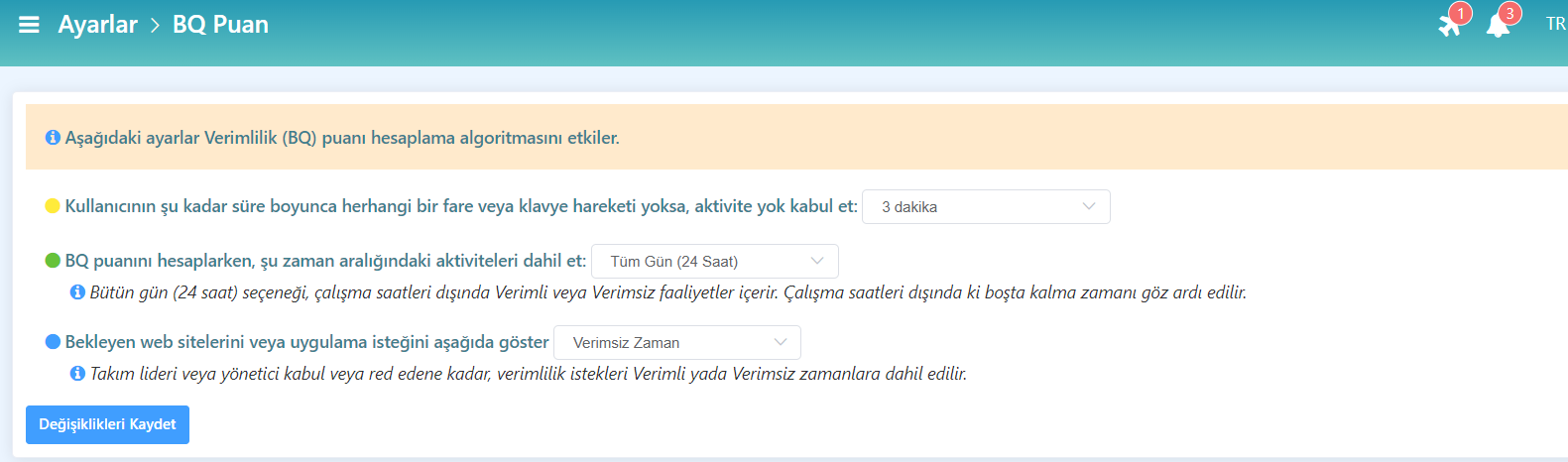 Bu ayar, BQ puanını hesaplarken 24 saatlik dönemi içerir. Bu süre içindeki Verimli ve Verimsiz aktiviteleri içerir. Çalışma saatleri dışındaki boşta kalma zamanı hesaplamaya dahil edilmez.