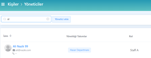 Ad-soyad ile arama yapabilmek için arama kutucuğuna yönetici ad-soyad bilgisinin birkaç karakterini yazarak, bu karakterleri içeren yöneticileri tüm kayıtlar arasından listeleyebilirsiniz.