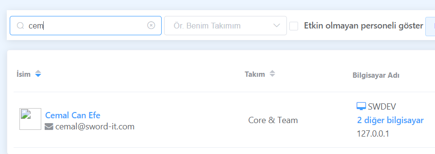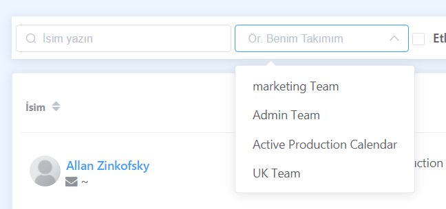 Bir takım seçerek, seçtiğiniz takımda yer alan personelleri listeleyebilirsiniz. Bu özellik, yöneticilerin takımlarının üyelerini görüntülemesini ve yönetmesini kolaylaştırır.