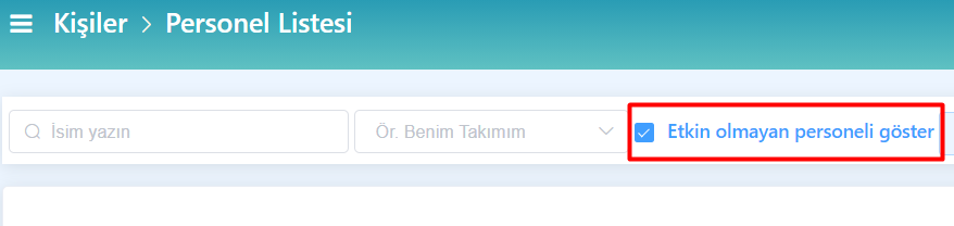 “Etkin olmayan personeli göster” filtresini kullanarak işten ayrılan veya pasif hale getirilen personel kayıtlarını görüntüleyebilirsiniz. Bu sayede, etkin olmayan personellerin kayıtlarını kontrol edebilirsiniz.