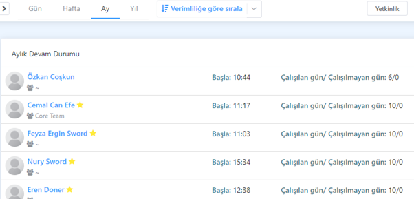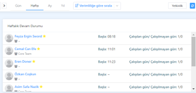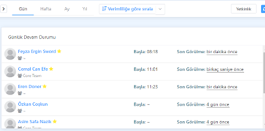 Günlük görüntülemede, çalışanlarınızın işe ne zaman başladığını ve anlık durumunu (Online, Boşta, Offline, İzin Durumu) görebilirsiniz. Bu sayede ekip üyelerinizin o günkü çalışma düzenini anlayabilir ve iletişim kurabilirsiniz.