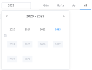 Tarih seçme takviminden “Yıl” seçeneğine tıklayarak, geçmiş yıllar da dahil olmak üzere istenilen tüm yıllar için seçim yapılabilir.