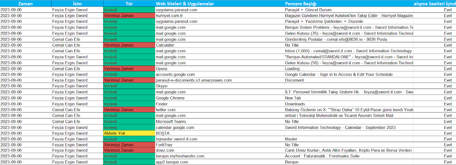 Berqun’un Aktivite Zaman Çizelgesi, personelinizin hangi saatlerde hangi sitelere girdiklerini, pencere isimlerini ve bu uygulamaların verimli ya da verimsiz olma durumlarını göstermektedir. Bunlara ek olarak da çalışma saati içinde mi yoksa dışında mı kullanıldığını görebilirsiniz.