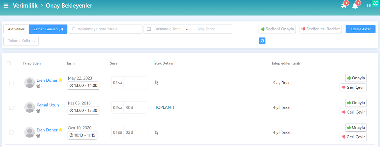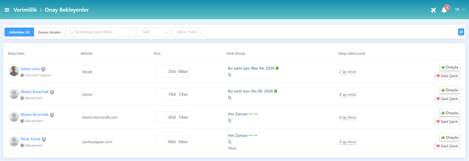 Berqun’un Verimlilik Paneli’nde yer alan Onaylanmış İstekler sekmesine tıklayarak çalışanların geçmişe dönük olarak onaylanmış verimli aktivite isteklerini veya zaman aralığı taleplerini görüntüleyebilirsiniz.