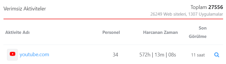 - Gelen ekranda sağ tarafta yer alan Verimsiz Aktiviteler listesindeki aktivitelerin sağ tarafında bulunan büyüteç işaretine tıklayın.
